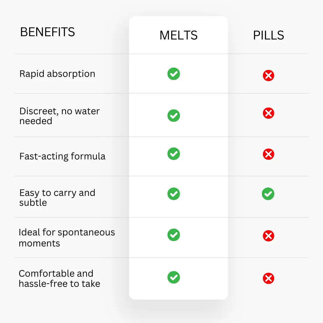 No pills, no fuss—just discreet melts that work quickly to give you the confidence and stamina to perform your best when it counts. Say goodbye to complicated timing and embrace an easy, discreet way to enhance performance.